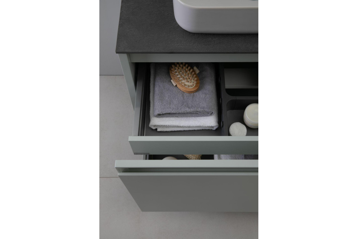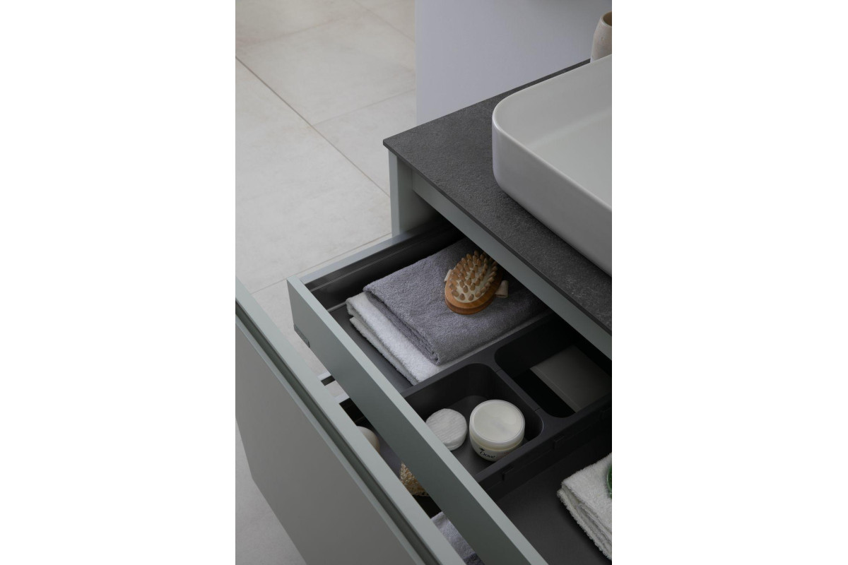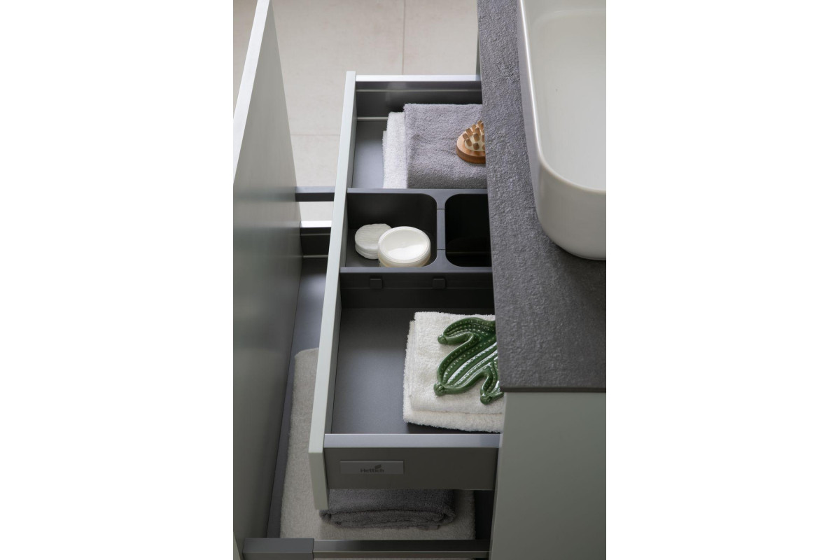 Выдвижные ящики с металлическими боковыми стенками в цвете серый металлик.