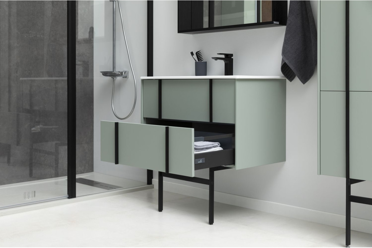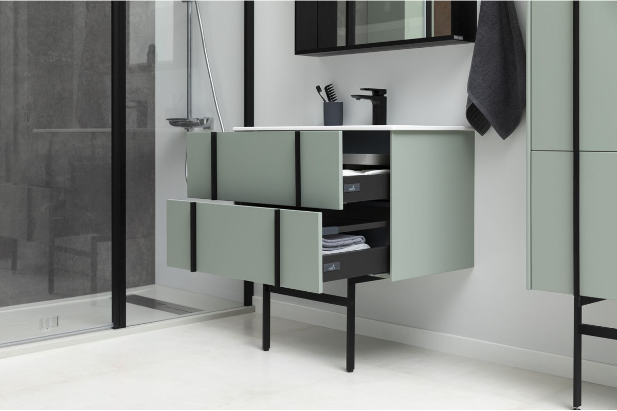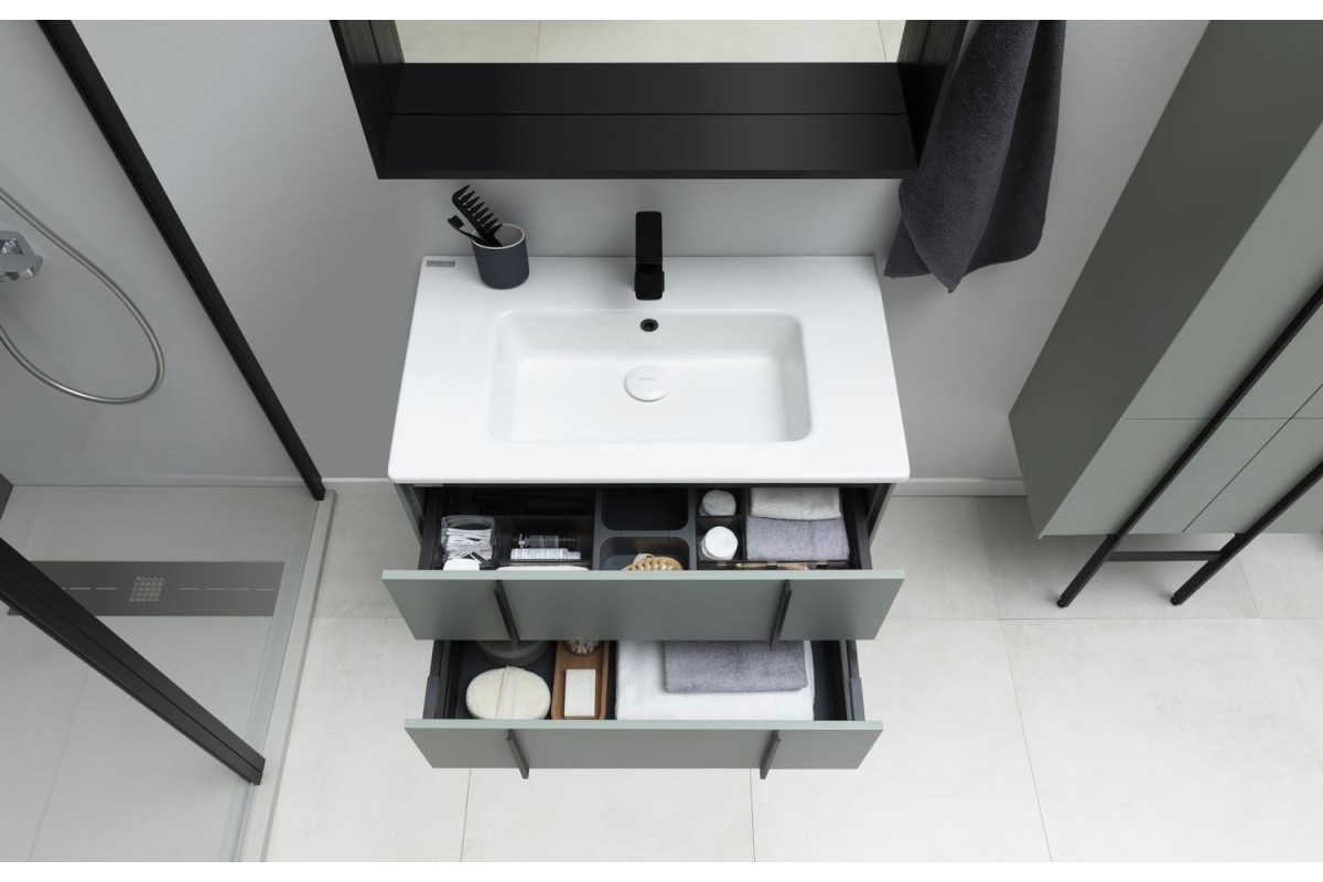 Тумбы оснащены специальной пластиковой рамой, которая надежно защищает вырез под сифон, служит органайзером и позволяет закрепить дополнительный набор контейнеров для хранения.